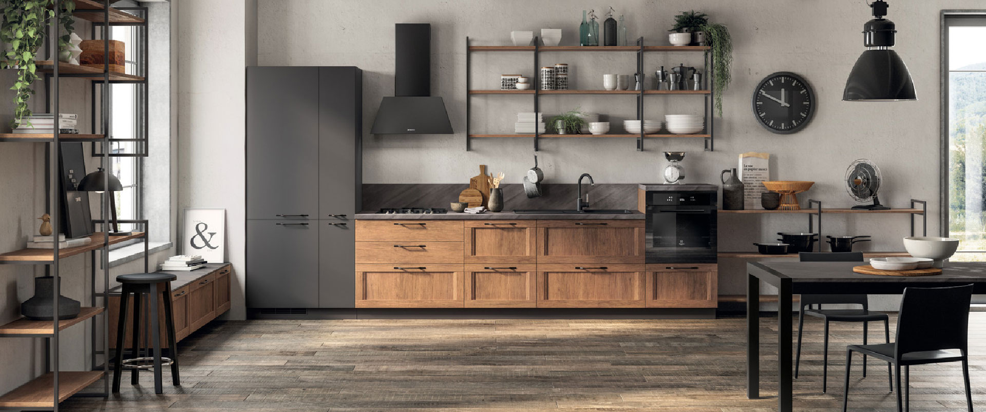 Il nuovo volto della cucina Sax – linea Scavolini Basic, design Vuesse – riesce a interpretare lo stile dei laboratori artigianali fino a creare ambienti domestici più raffinati.
