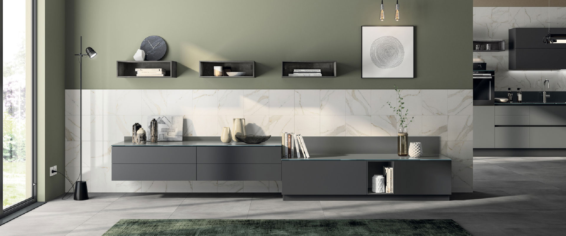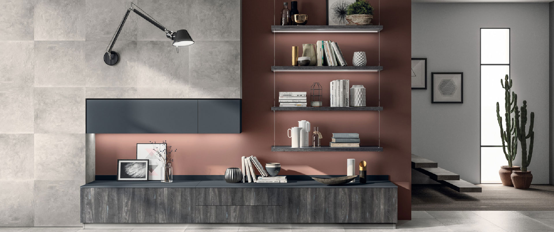 7 / 7 - In questa configurazione si incontrano materiali interessanti e di tendenza: basi in laccato opaco Grigio Ferro SCAV374