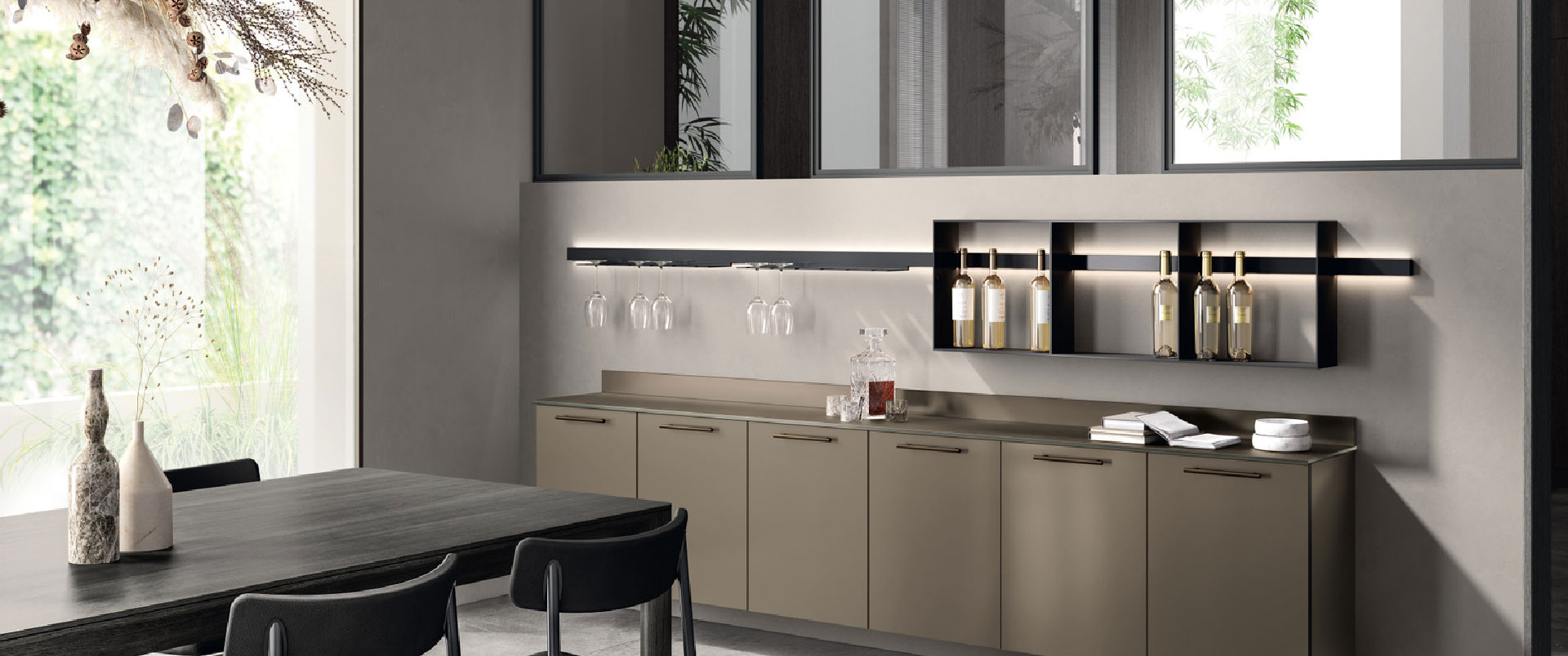 2 / 4 - Ante e piano vetro opaco Grigio Matera. Barra sottopensile e accessori “Sign”.